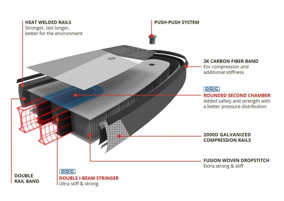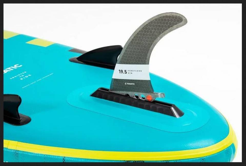 NEU sind die hochwertigen, 2000D verzinkten Railbands, die dem Board noch mehr Stabilität geben. Die werkzeuglose Finne ist super schnell und einfach montiert.