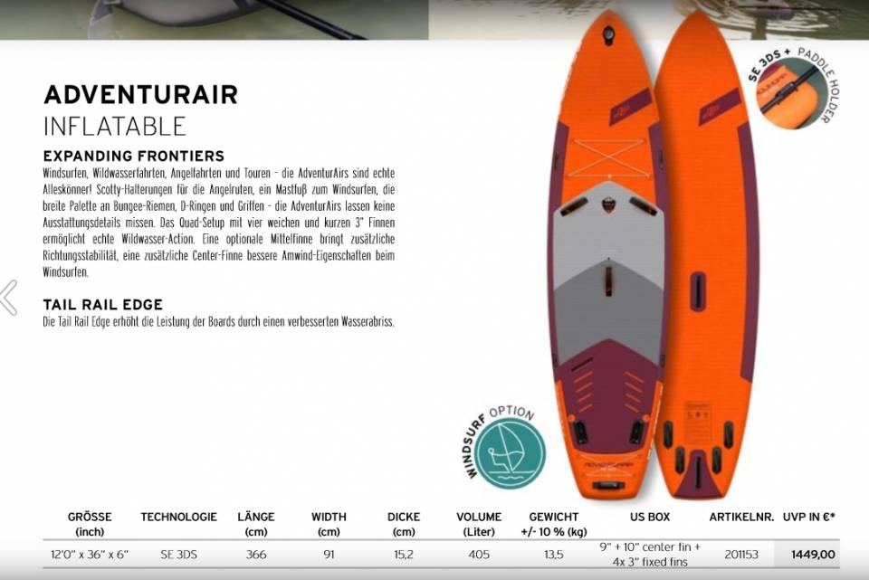 Das JP Windsup ist annähernd baugleich zu dem AllroundAir von JP, besitzt aber eine Windsurfoption. Daher wurde in diesem Board auch eine zweite US-BOX zur Aufnahme einer zweiten Finne verbaut. Unsere Team gehen bei leichtem Wind gerne mit dem Board auch Windsurfen. Das Board lässt sich super paddeln und hast einen guten Geradeauslauf. Preis Leistung sind hier Top. Die Boards gibt es auch als Komplettset inkl. Paddel und Rig Segel usw.