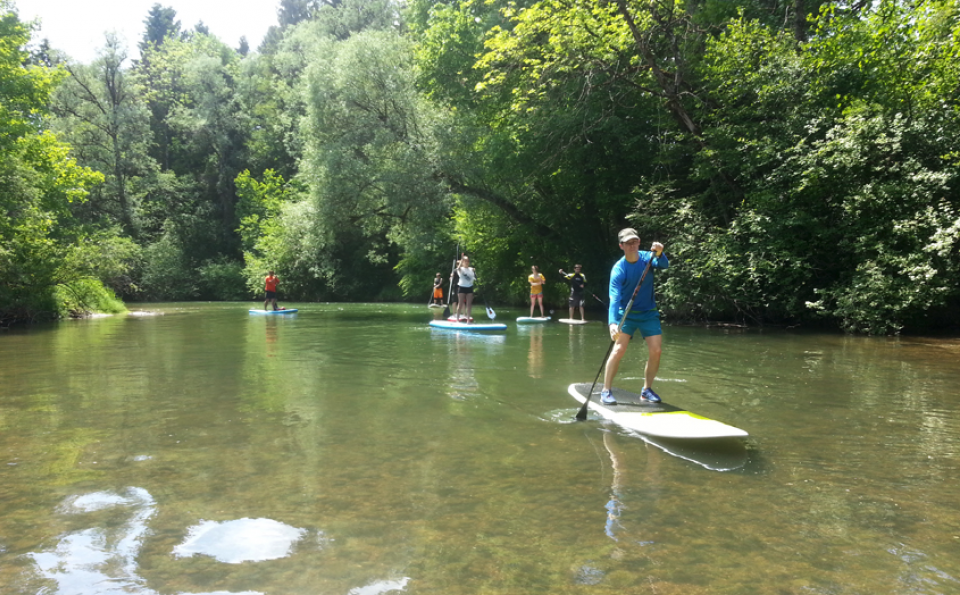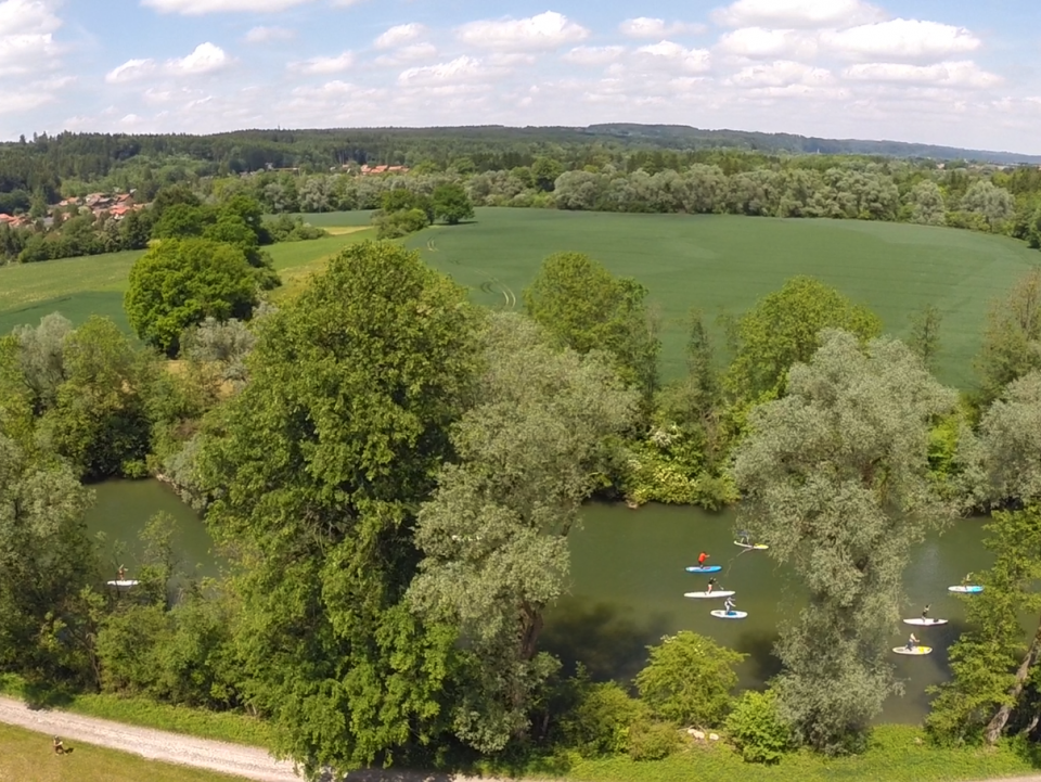 Dauer 2,5 - 3 Stunden 59 € inkl. SUP Board, SUP Paddel, Neoprenanzug, Neoprenschuhe - Bavarianwaters SUP Tour und Kurs an einem Fluss (Zahmwasser)