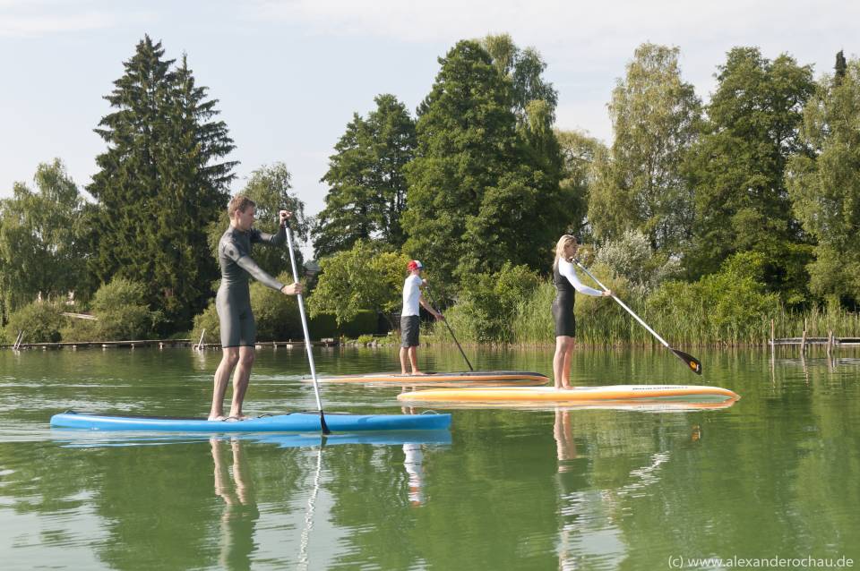 Es gibt in Bayern wunderschöne SUP Seetouren, die körperlich nicht so anstrengend sind und doch ein fitnessorientiertes Naturerlebnis bieten. Jeder, der das Schwimmen beherrscht, kann mitmachen. Wir möchten alle Altersklassen und Könner-Stufen ansprechen, Jung und Alt den Sport erklären und gemeinsam eine schöne Stand Up Paddle Tour genießen. Unsere SUP Seetouren begeistern sowohl absolute Beginner als auch Fortgeschrittene. An unseren SUP Stationen werden auch SUP Touren-Spezials für Gruppen angeboten. Unsere SUP Touren und Kurse werden von Profis und speziell ausgebildeten SUP-Guides betreut.